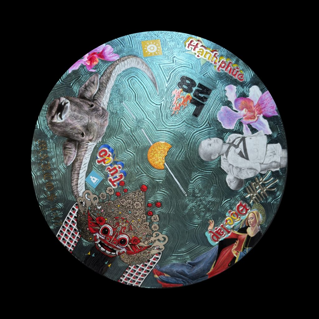Tan Kai Sheuan: Nothing Exists Alone 7257027 (Gold leaf, silver Leaf, marker pen, acrylic on curved circular stainless steel, 2025)