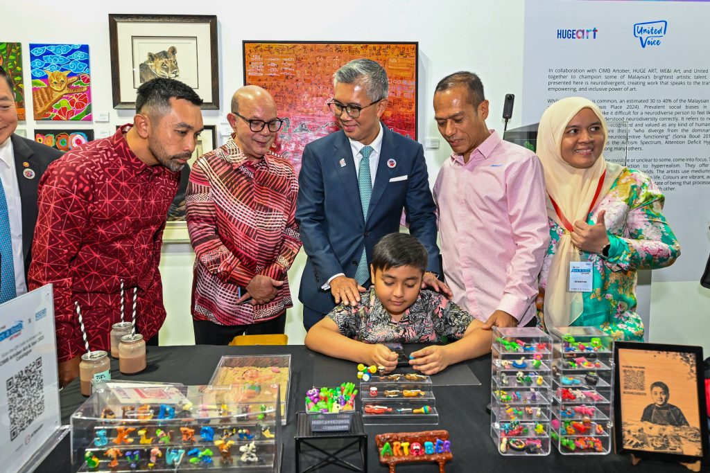 (From left) Novan Amirudin, Group Chief Executive Officer of CIMB Group, Datuk Syed Zaid Albar, Chairman of CIMB Group, Datuk Seri Utama Tengku Zafrul Aziz, Minister of Investment, Trade and Industry, visiting the booth of young neurodivergent artists from HUGEArt at CIMB Artober Art & Soul 2025.